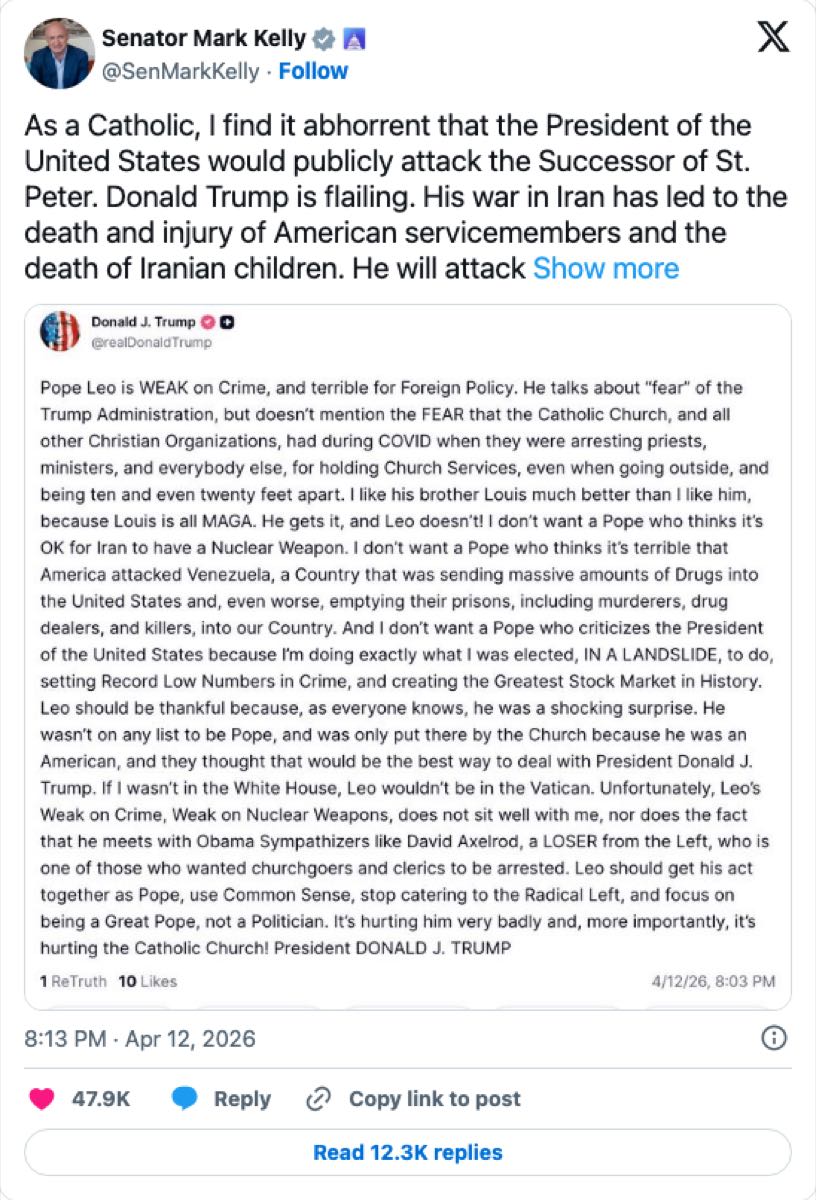 Senator Mark Kelly's statement — "Donald Trump's war in Iran has led to the death and injury of thousands of American troops" — frames the domestic political cost. A 50% oil price increase and soldier casualties are combustible politically. The administration needs a resolution before the political cost compounds.